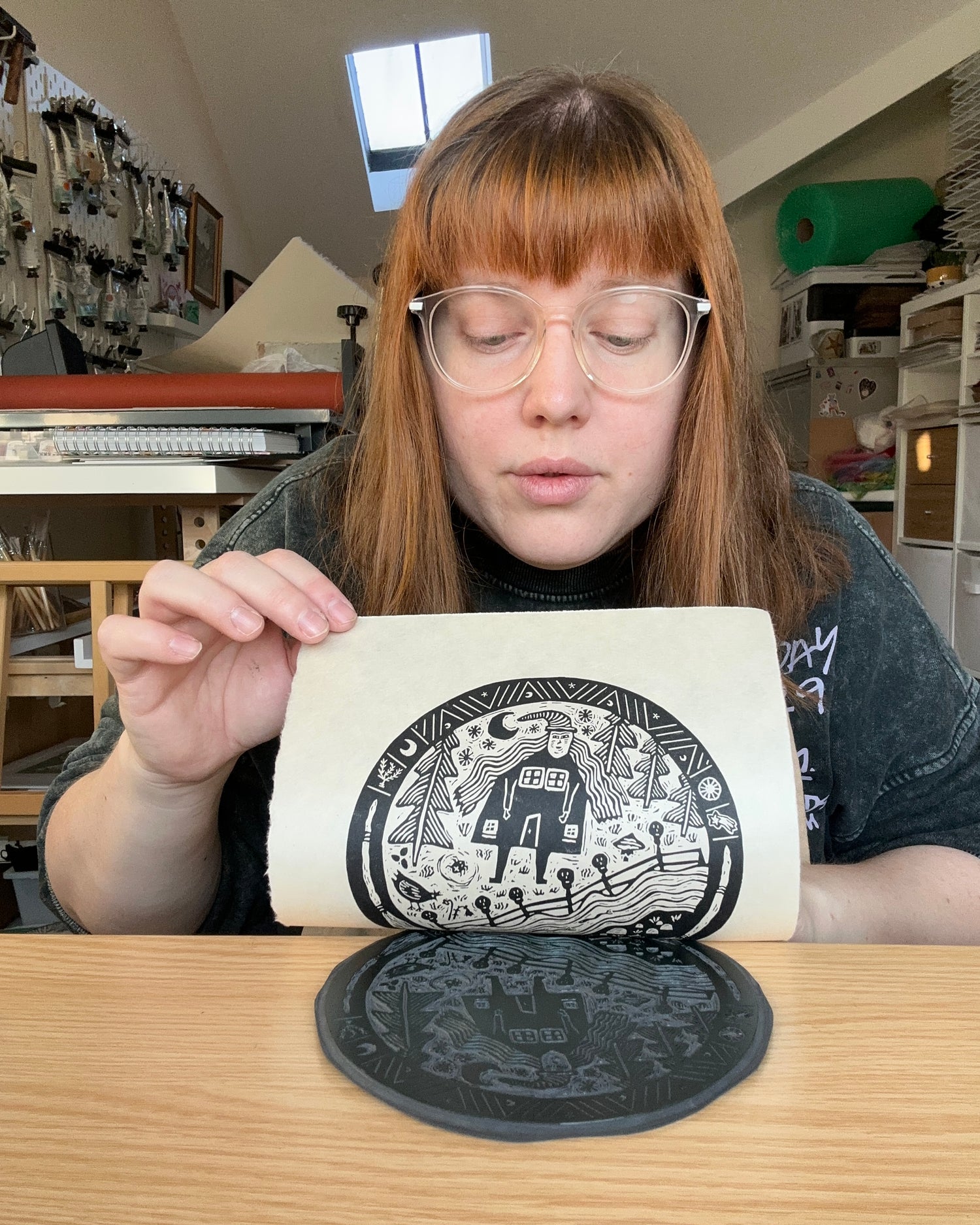 Each step of the process is intensely satisfying and carving each block a chance to try new cuts and techniques. What most excites me is to incorporate my view of the world and my interests into my linocut prints.'